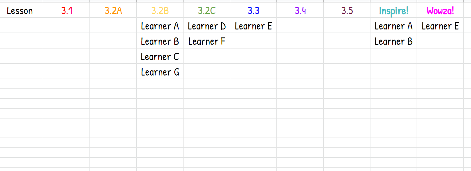 A pace tracker shows each lesson within the unit and where each learner is on his/her learning path. It is displayed during class for all students to view (many students will politely remind you when they need to move ahead a lesson). When we see that a group, generally five or more students, is having the same misconception(s) or is making the same error(s), we know that it is time to reteach that skill to the whole group. This pace tracker also gives us a way to point out learners who are all-stars and can become student-teachers to help others who are struggling.