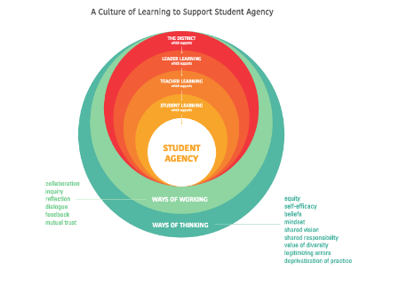 It’s not coincidental that self-assessment and peer feedback are at the heart of the adult learning model, too. The project’s theory of action is based on research showing that student agency emerges from a culture of learning, as shown in this diagram: