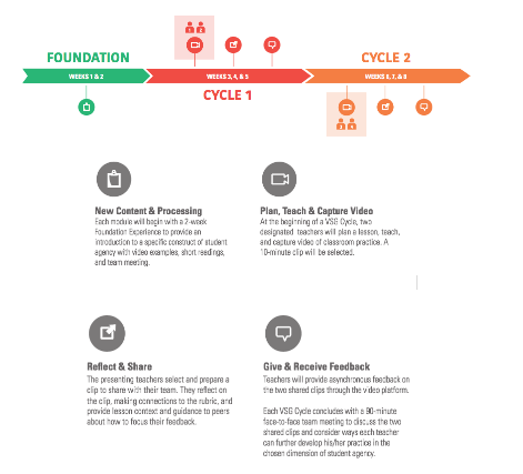 In small teams, teachers spend the first two weeks (“Foundation”) learning about the project’s construct of student agency. Then, pairs of teachers run through two three-week cycles in which they capture video of their classroom, self-assess using the continuum, and then give and receive feedback. The continuum is structured like a rubric, but it is not designed for evaluation or scoring. Instead, it’s a tool for teachers to self assess, and to have peer feedback discussions about learning in their classrooms which lead to next steps in teachers’ practice.
